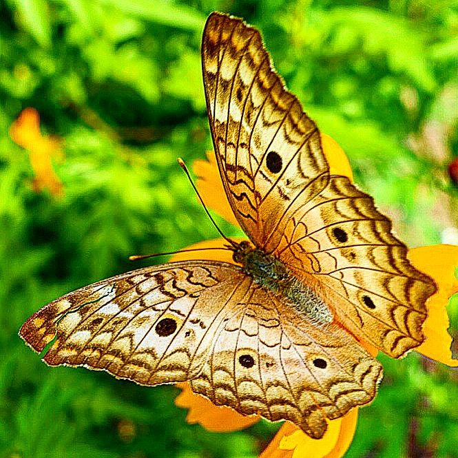 A borboleta repousa com as asas abertas, revelando desenhos naturais que parecem pintados à mão. O contraste com o verde ao fundo destaca a delicadeza do momento. Um instante de leveza e beleza captado pelo olhar sensível do Bruce.
