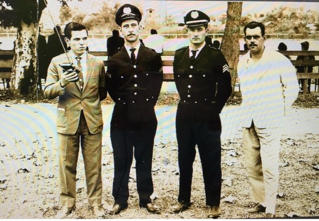 O ano é o ‘recente’ 1965, local, o estádio Municipal Alfredo João Krieck (Rio do Sul) ainda sem alambrado e com um cercado de madeira como única proteção. Devidamente ‘protegidos’ por dois guardas municipais, o saudoso apresentador Nilton Novaes e o repórter que subscreve este espaço. Notaram a elegância? O narrador era Osny Gonçalves (Rádio Mirador), o jogo, apesar de recente… não lembro.