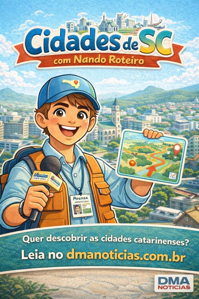 O primeiro a entrar em cena é o simpático Nando Roteiro, anfitrião da série “Cidades de SC”. Ele é o repórter viajante que percorre o estado para mostrar curiosidades, história, cultura e o que cada município tem de melhor. Com carisma e espírito explorador, Nando ajuda a transformar cada cidade em um destino vivo — não apenas no mapa, mas na memória do leitor.