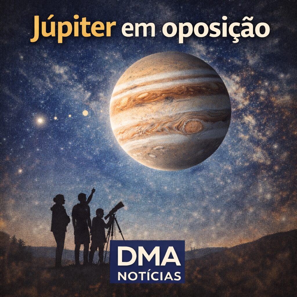 No dia 10 de janeiro de 2026, o maior planeta do Sistema Solar atinge a oposição — fica mais perto da Terra, mais iluminado e visível a noite inteira, com chance real de observar suas principais luas até a olho nu com ajuda simples.