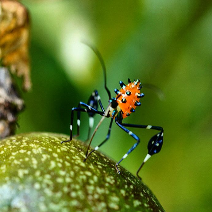 Com cores vibrantes e forma curiosa, a ninfa de percevejo-assassino se destaca sobre o fruto, exibindo sua postura de caçador. Mesmo jovem, revela a eficiência de um predador nato da natureza. Um detalhe raro e preciso captado pelo olhar atento do Bruce.