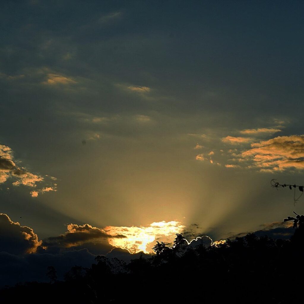 A luz do sol rompe o horizonte e se espalha em feixes dourados entre as nuvens densas. As silhuetas das árvores em primeiro plano reforçam o contraste do céu dramático. Um fim de tarde contemplativo registrado pelo olhar sensível do Bruce.